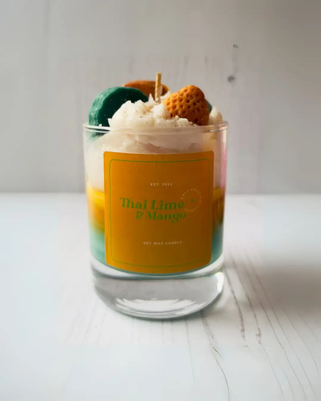 A tropical escape in a jar. Thai Lime & Mango brings a zesty, refreshing burst of sunshine to your home—perfect for brightening up any afternoon. Handmade with Love.
